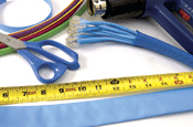 Measure the heatshrink tubing to length and cut with a scissor. The thickness of your bundle, as well as the desired final appearance, will determine the length of the tubing you cut. Generally, a piece 1 1/2″ – 2″ long will accommodate almost any need (such as this bundle of 10 CAT-5 network cables). Single wires or smaller bundles will require shorter pieces.