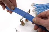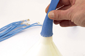 Terwijl de afgesneden uiteinden van je sleeving nog steeds heet zijn, gebruik je een omgekeerde trechter (een punttang of schaar werkt ook goed) om het uiteinde iets te laten uitlopen. Hierdoor kan de sleeving gemakkelijk over uw applicatie schuiven en stekkers of connectoren omvatten zonder te blijven haken of te trekken.
